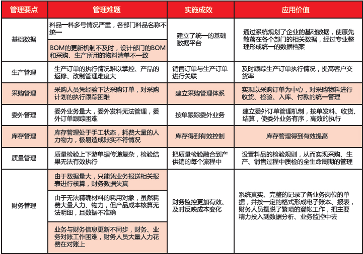 管理難點(diǎn):在手工模式下,生管部與銷售部的溝通不通暢,由于生產(chǎn)周期非常長,下達(dá)的生產(chǎn)任務(wù)與銷售的實(shí)際產(chǎn)品有出入,制造部門領(lǐng)料依據(jù)不統(tǒng)一,領(lǐng)料單的版本不能及時(shí)更新,采購的物料與技術(shù)要求不一致,有時(shí)只能下達(dá)緊急采購任務(wù)來達(dá)成交貨要求,有些形成物料積壓,對庫存壓力很大;